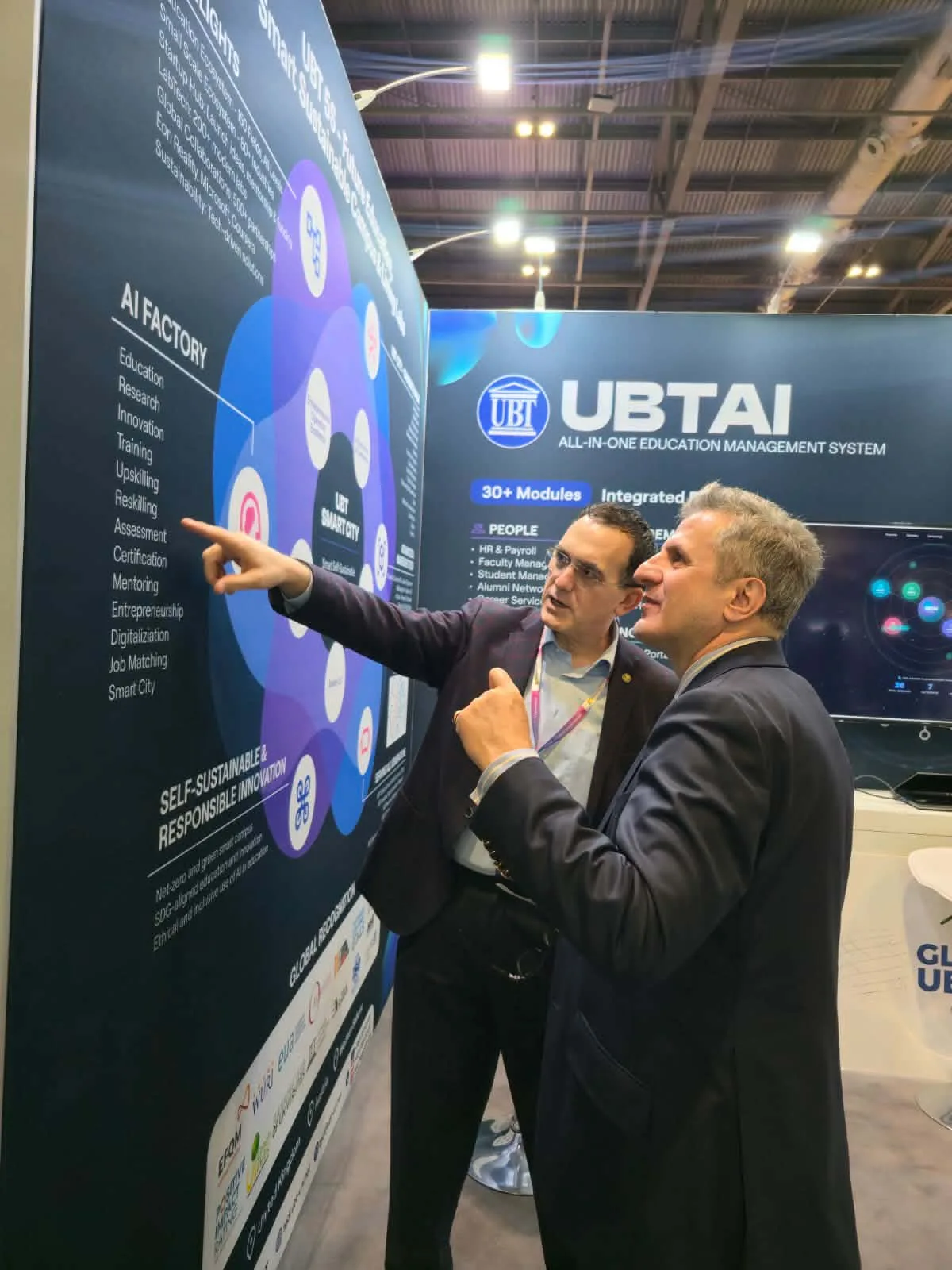 Ambasadori u mirëprit nga Rektori i UBT-së, Prof. Dr. Edmond Hajrizi, i cili prezantoi aktivitetet, projektet dhe inovacionet që po përfaqësojnë Kosovën në këtë ngjarje prestigjioze ndërkombëtare. Ai theksoi rëndësinë e pjesëmarrjes në panaire të tilla globale, si një mundësi e rëndësishme për promovimin e arsimit, teknologjisë dhe inovacionit kosovar në skenën ndërkombëtare.