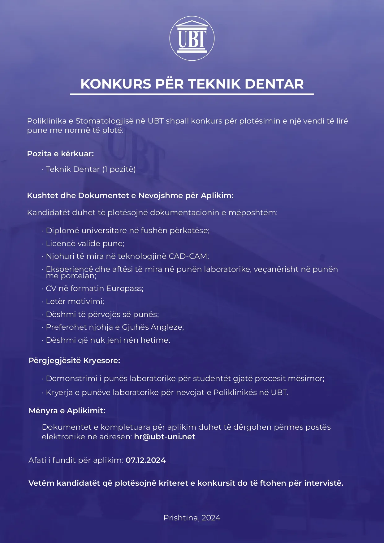 29/11/2024KONKURS PËR TEKNIK DENTAR NË POLIKLINIKËN E STOMATOLOGJISË – UBT