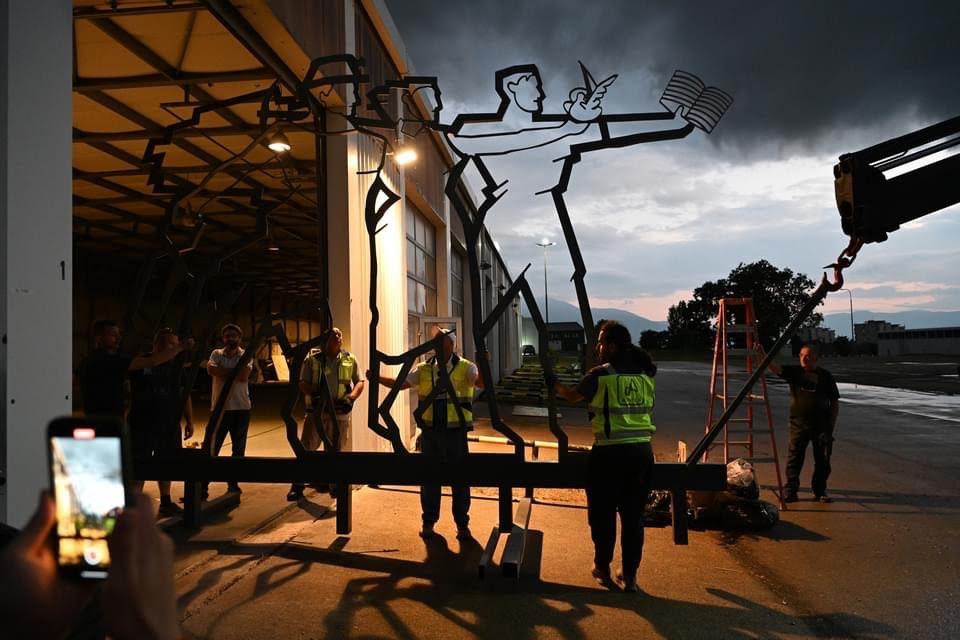 Muja tani ka ri-instaluar një monument të vjetër/të ri/të lëvizshëm “Work, Freedom, Education”, në shtëpinë e tij në Sheshin e Mitrovicës.