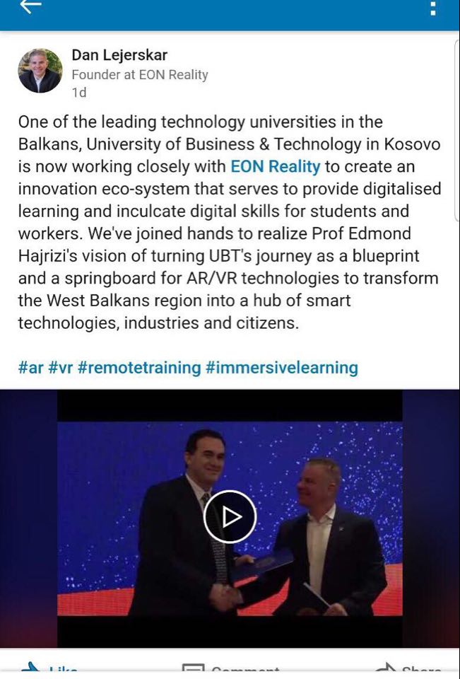 “Ne i jemi bashkuar vizionit të prof. Edmond Hajrizi për ta kthyer rrugëtimin e UBT si një plan dhe një trampolinë për teknologjitë AR / VR për të shndërruar rajonin e Ballkanit Perëndimor në një qendër të teknologjive, industrive dhe qytetarëve të zgjuar”, thuhet në postimin e presidentit të EON Reality, Dan Lejerskar.